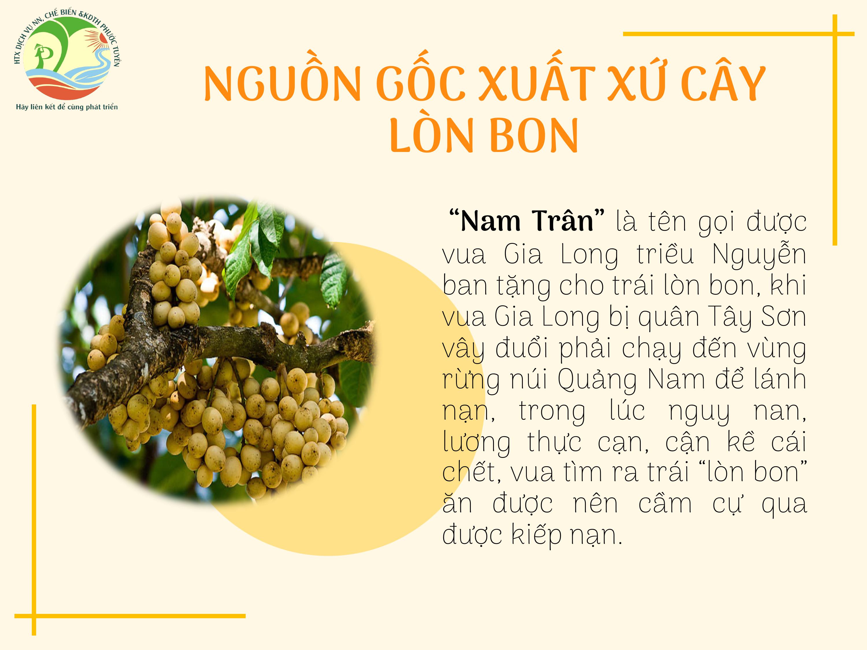 Phước Tuyên - Vùng Đất Tiên Phong Trong Nông Nghiệp Sạchlà sản phẩm được lên men hoàn toàn tự nhiên từ trái lòn bon (bòn bon) được sản xuất theo tiêu chuẩn VietGap; được chứng nhận tiêu chuẩn OCOP 4 sao của tỉnh Quảng Nam; là đặc sản vùng miền tại huyện Tiên Phước, sản xuất tại HTX NN Phước Tuyên; số 177 đường 10/3, thị trấn Tiên Kỳ, huyện Tiên Phước, tỉnh Quảng Nam; được khách hàng trong và ngoài nước tin dùng